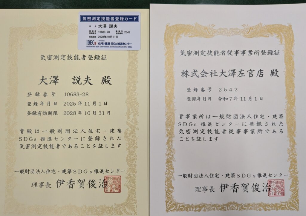 このたび、当社は気密測定技能者登録証の事業者登録を行いました。
